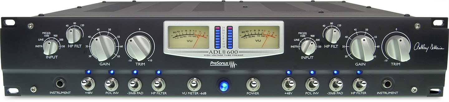На каждом канале Anthony DeMaria ADL 600 имеются симметричные трансформаторные mic/line входы (разъемы XLR на задней панели), высокоомный (100 кОм) инструментальный вход (джек на передней панели), селектор входа (инструментальный, линейный или микрофонный с четырьмя вариантами импеданса: 1500, 900, 300, 150 Ом), переключатели фантомного питания (+48 В), полярности, аттенюатора (-20 дБ) и ВЧ-фильтра (6 дБ/окт), шаговый аттенюатор чувствительности (шагами по 5 дБ) и регулятор выходного уровня (+/-10 дБ), стрелочный и восьмисегментный светодиодный индикаторы выходного уровня, симметричный трансформаторный линейный выход (XLR на задней панели). Также на передней панели ADL 600 имеются переключатели питания и чувствительности индикаторов (-6 дБ), на задней — терминал для заземления, радиатор охлаждения и гнездо для кабеля питания. Размеры (ШxвXг) 89x432x483 мм, 2U, вес 12,7 кг.