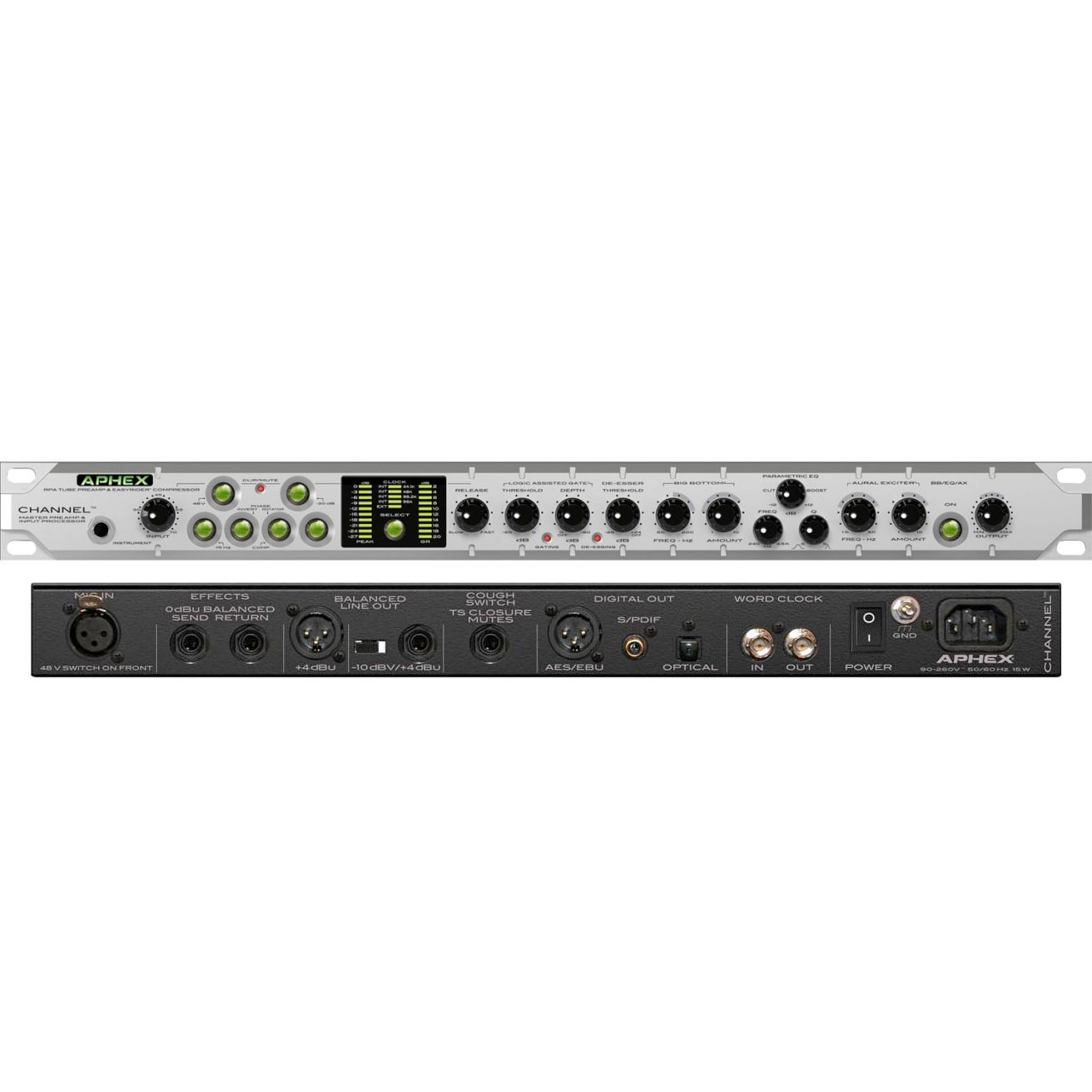 По запросуAphex CHANNEL - Ламповый микрофонный предусилитель + компрессор (Easyrider®) + гейт (Logic-Assisted Gate) + раздельно-полосный де-эссер + параметрический EQ + эксайтер (Aural Exciter + Big Bottom) + ЦАП 24 бит, 96кГц, AES, S/PDIF.