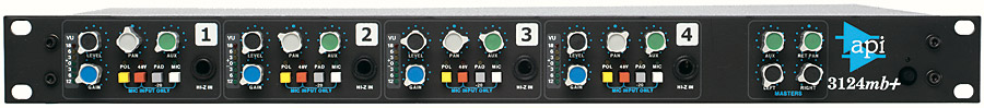 В модели 3124MB+ используется та же схема микрофонного предусилителя, что и во всех консолях API. В ней применен трансформатор микрофонного входа RE-115K и тот же выходной трансформатор, который используется во всех эквалайзерах API. На все четыре микрофонных входа модели 3124MB+ от встроенного блока питания подается фантомное питание 48 В, отключаемое для каждого канала с передней панели. Кроме того, на передней панели имеется переключатель аттенюатора 20 дБ, одинаково влияющий на сигналы микрофонного и линейного входов.