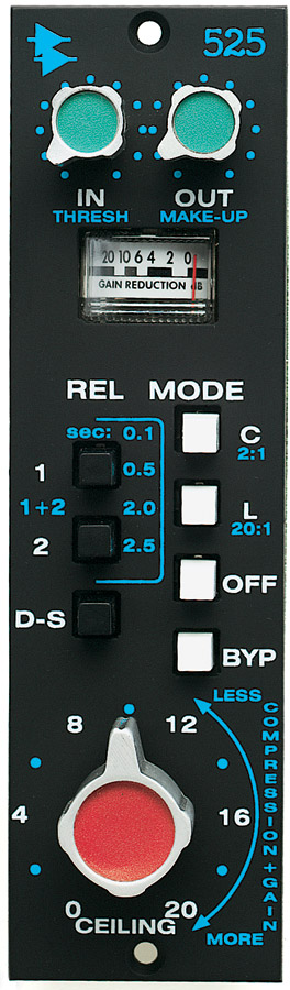 Время восстановления изменяется в зависимости от частоты, то есть время восстановления высокочастотных/широкополосных сигналов выше, чем низкочастотных сигналов, что позволяет естественным образом отслеживать огибающую. Время атаки фиксировано и выбрано таким образом, чтобы захватывать самые резкие повышения уровня. Модель 525 одинаково полезна для трекинга, микширования или использования в качестве компрессора/лимитера. В ней используется «фирменное» динамическое управление и легкий в использовании многофункциональный набор элементов управления. Модуль 525 имеет переключатель для выбора фиксированного проводного обхода, симметричный вход и разводку выводов, как у всех остальных модулей серии 500. Для осуществления многоканальной компрессии можно использовать совместно два и более модуля 525.