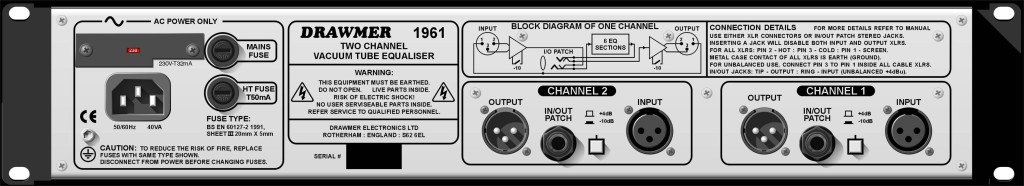 - ¼-дюймовые гнезда на задней панели служат для непосредственного подключения в режиме вставки вспомогательной схемы или соответствующих разъемов микрофонного предусилителя/лампового компрессора модели Drawmer 1960.
