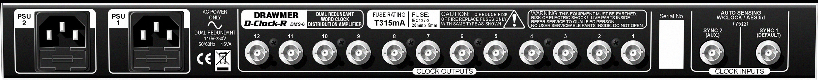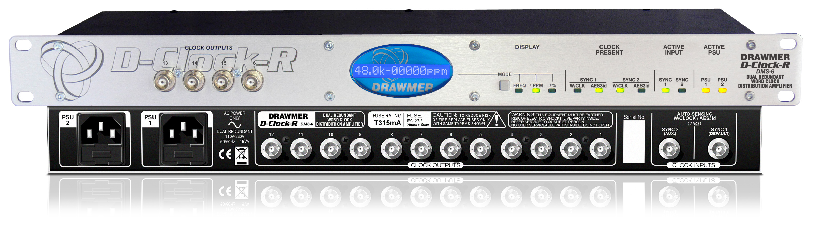 Drawmer D-Clock-R оснащен двумя входами Clock: основным и резервным. Система сама переключится на резервный сигнал в случае выхода из строя основного синхронизатора. Тот же подход применен и к питанию прибора: D-Clock-R имеет два одинаковых, но при этом независимых блока питания, которые он может использовать как по отдельности, в качестве страховки от сбоев одного из источников, так и одновременно, для равномерного распределения нагрузки — ваше шоу будет продолжаться, невзирая даже на технические трудности.