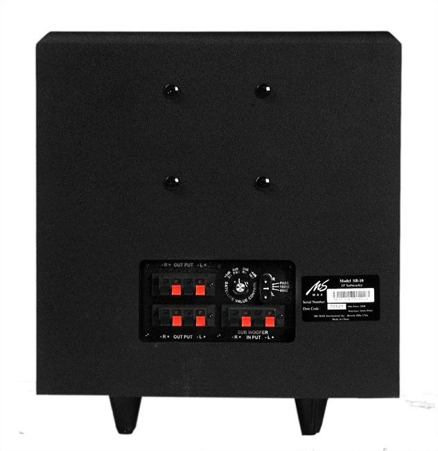 Арт.: Я0002382MS-MAX SB10 - сабвуфер инсталляционный, 10", 8Ω, SPL 85дБ, 50-500 Гц, встроенный кроссовер с выходами на саттелиты и регулируемой частотой среза, регулируемая нагрузка, мощность 120 Вт, пиковая 240 Вт, возможна установка на пол, предусмотрено крепление на стену, цвет черный, 336х336х310 мм, 15 кг