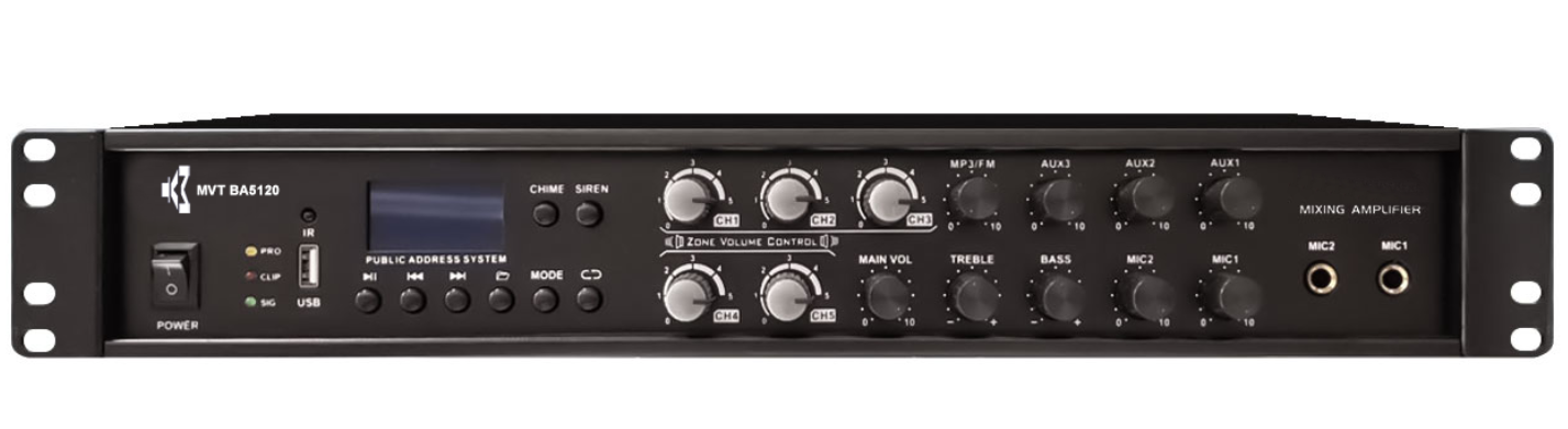 Профессиональные интегрированные пятиканальные микшеры-усилители MVT BA5120 предназначены для воспроизведения речи и музыки при постоянной работе в системах усиления звука и оповещения в церквях, школах, офисах, аренах, залах заседания в отелях, развлекательных центрах, центрах отдыха, барах, фитнесс центрах и других местах, требующих высоких рабочих характеристик, гибких функций и высокой надежности. Усилители MVT BA5120 работают как с обычной низкоомной нагрузкой, так и с трансляционными линиями 70/100 В.
