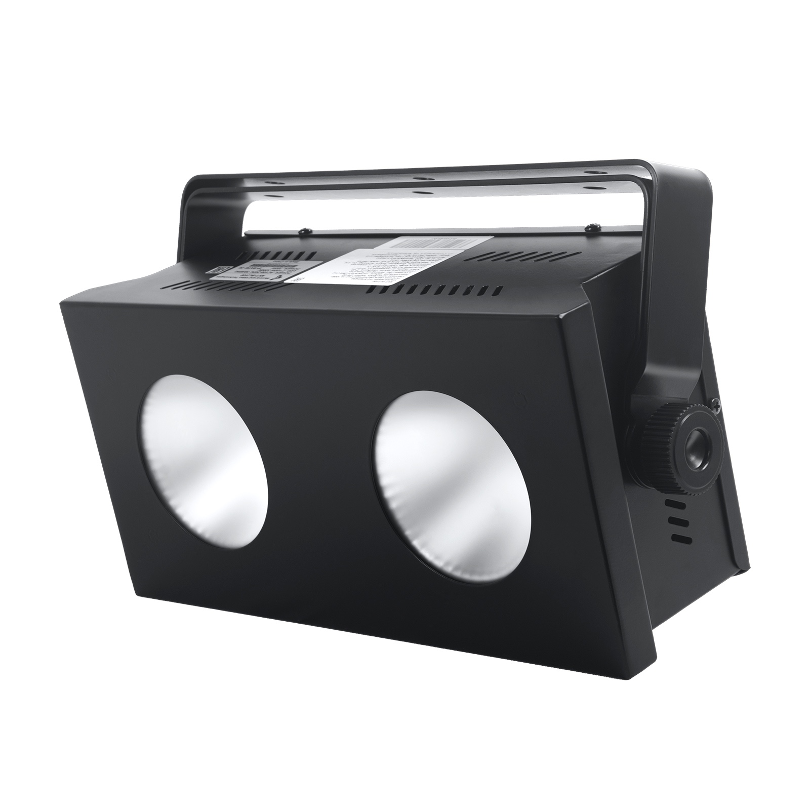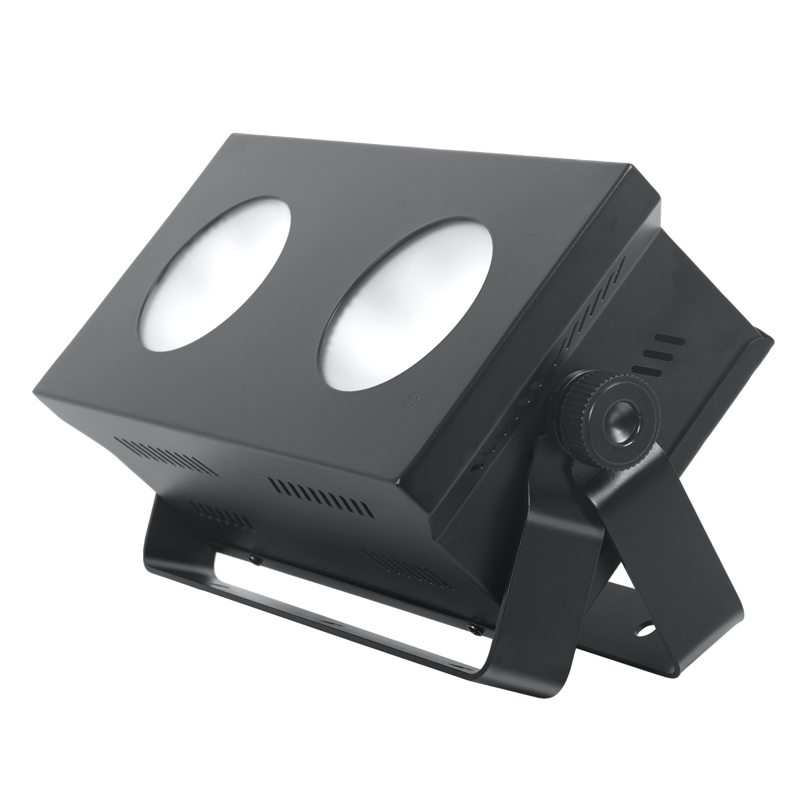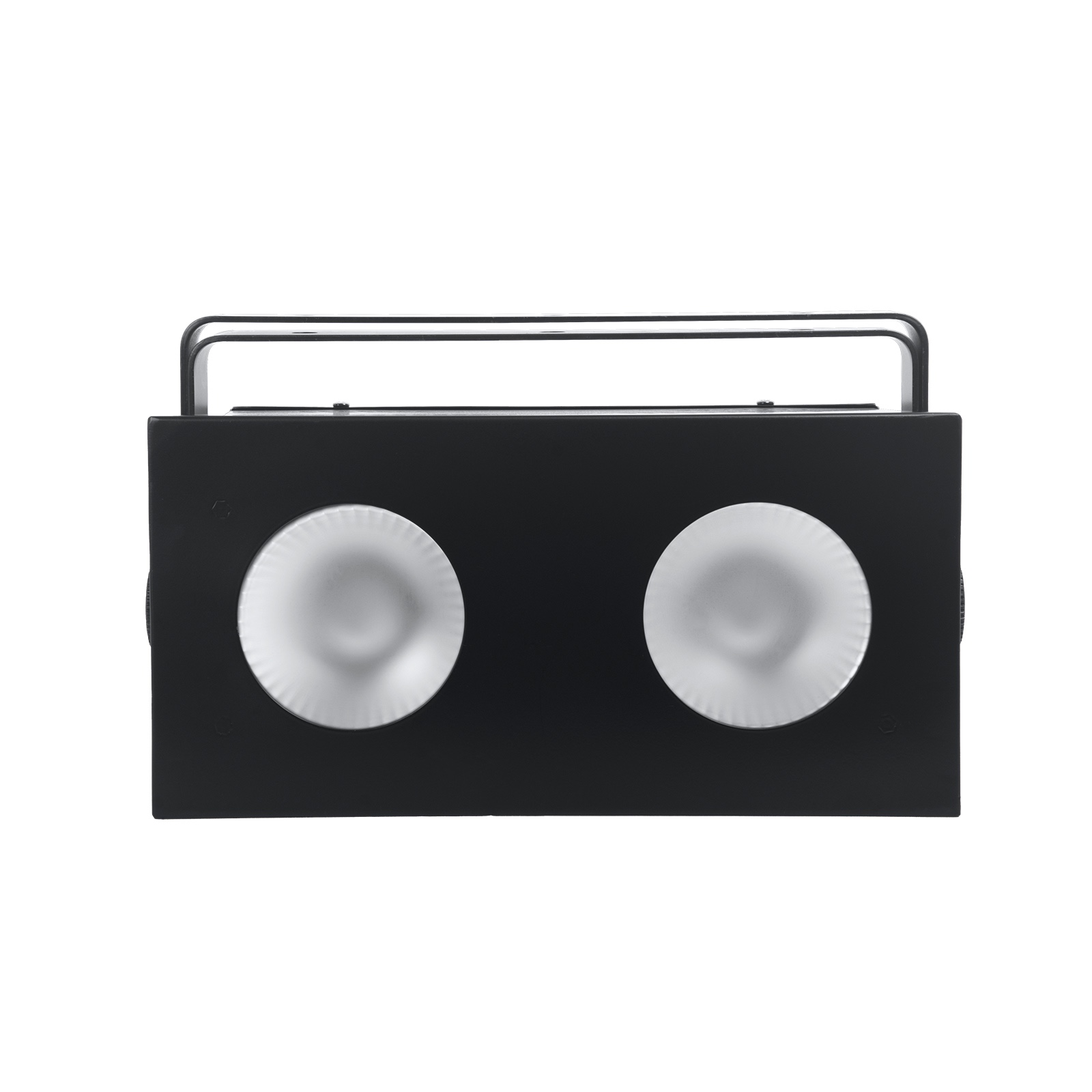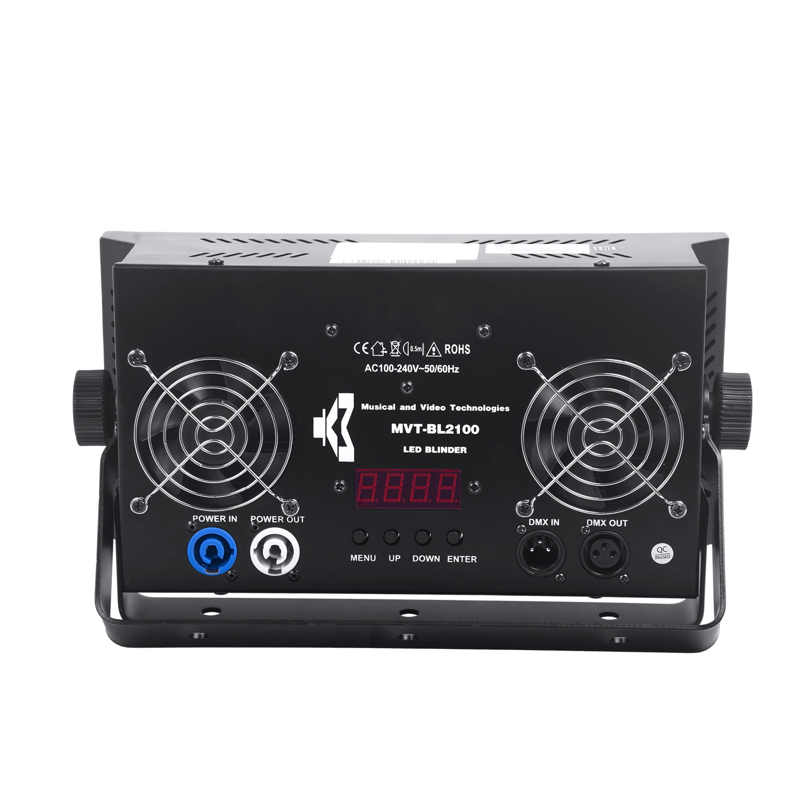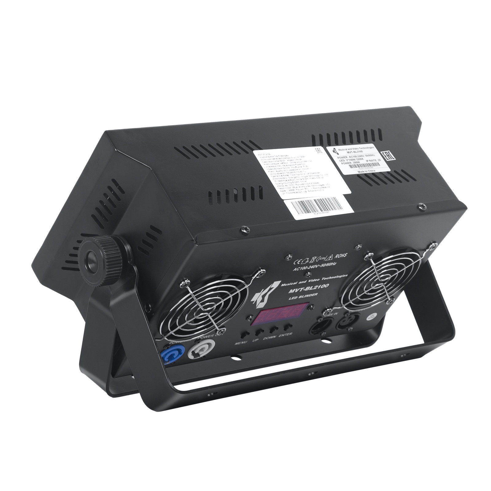 MVT BL2100 - Ультра яркий 1x2 блайндер с двумя COB светодиодами 2в1 (белый и теплый белый) мощностью по 100 Ватт, каждый из которых управляется индивидуально (функция pixel mapping control), в аллюминиевом корпусе. Светильник имеет широкий угол — 75°, а среди эффектов доступны импульсные, мгновенное открытие и плавное диммирование, а также строб. Для контроля устройством доступны 2 режима DMX: 4, 8 каналов. Режимы управления: DMX512, звуковая активация, мастер-ведомый, авто. Цветовая темература: 3200~6500K. В комплекте струбцина для крепления прибора к перекладине или ферме и страховочный тросик. Версия для использования только внутри помещения