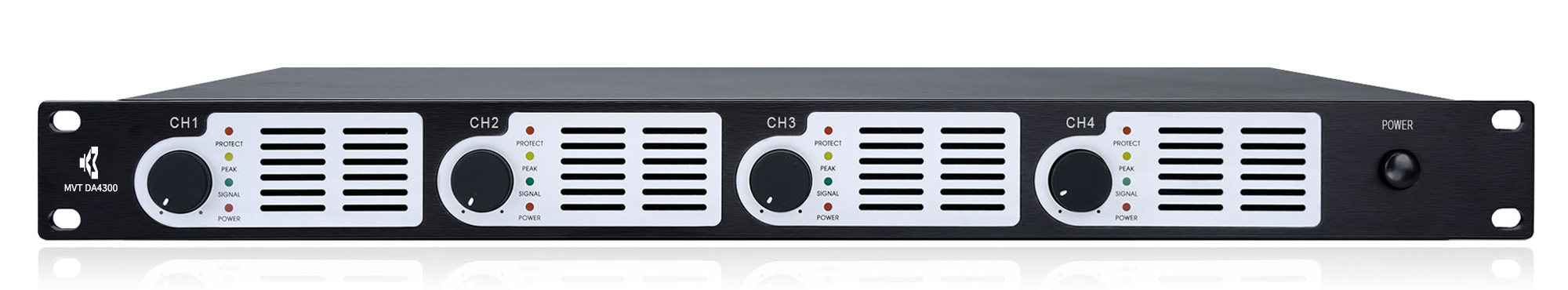 MVT DA4300 - Трансляционный усилитель мощностью 4х300Вт (70/100В) 1U. АЧХ: 20Гц-20кГц(±0.5дБ), соотн