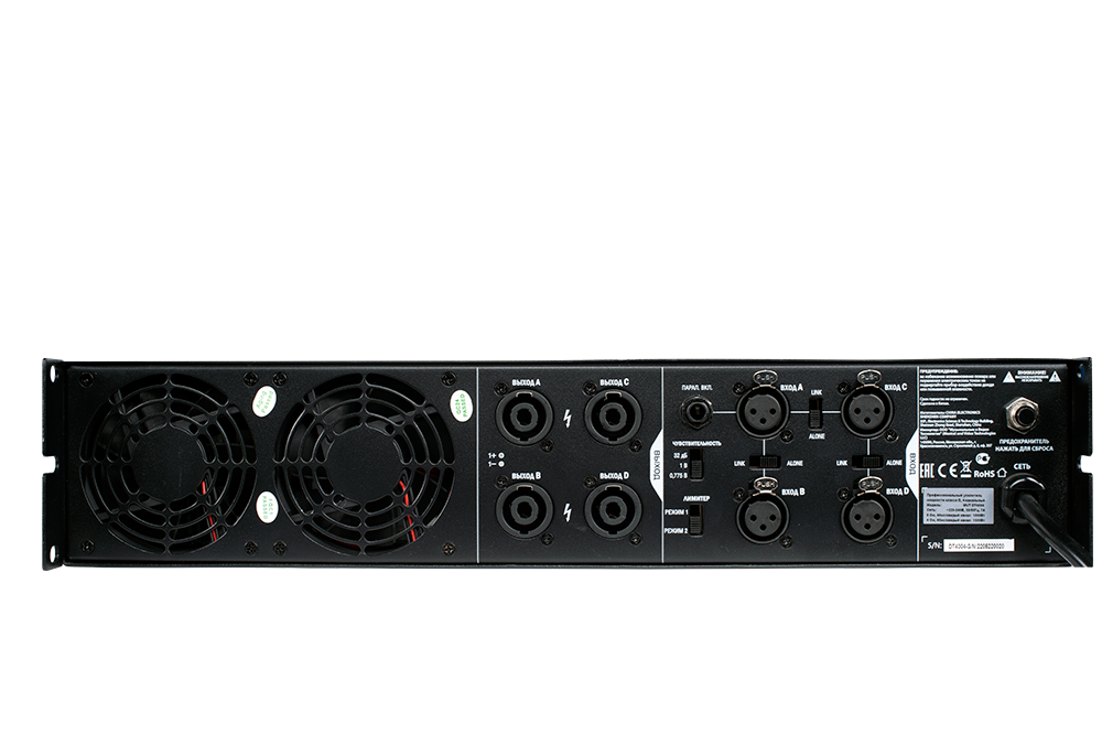 Арт.: Я0015637MVT DT4004 - Усилитель мощности класса D, 4-канальный. Эффективная система охлаждения; стабилизированный (трансформаторный) блок питания повышает надежность работы при перепадах напряжения. Входы: 4 балансных XLR; выходы: 4 разъёма Speakon NL4, 1 разъем TRS для каскадирования; световые индикаторы и регуляторы громкости на передней панели. Мощность: 4х1000Вт@8Ω, 4x1500Вт@4Ω, 20Гц–20кГц, демпинг-фактор >500 @ 8Ω/100Гц, уровень S/N > 105дБ, а, высота 2U, 482×89×380мм, 19,57 кг.