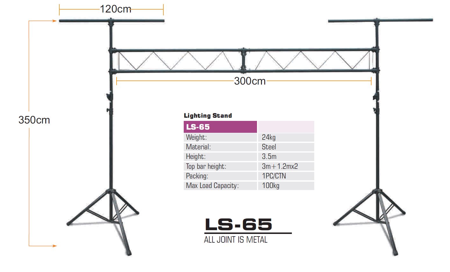 Комплект для установки светового оборудования. Два трипод-стэнда, стальных , Т-типа (с перекладинами), для установки светового оборудования, максимальная высота 3,5м, длина перекладин 120см, и 3 метровая плоская двойная ферма для установки между триподами. Вес 24кг, максимальная нагрузка 100кг, соединения выполнены из металла (сталь).
