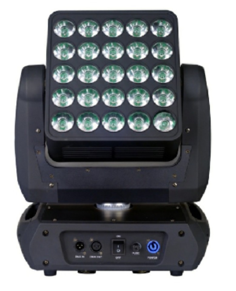 По запросуВращающаяся голова, с матричной (5 х 5) светодиодной панелью в качестве подвижного оптического модуля, предназначенная для эксплуатации внутри помещений, с дополнительным каналом управления по протоколу ArtNet. В качестве источника света используются 25 х RGBW Osram Ostar 4-в-1 светодиодов с полностью автономным пиксельным управлением (Pixel Control). Для управления используется протокол DMX512. Для ручной настройки применяется LCD дисплей с кнопками меню. Предусмотрены возможность диммирования и строб-эффект, анимация, цветовые предустановки. Для звуковой активации применяется интегрированный в корпус микрофон. Движение непрерывное, с разрешением 16 бит, с реверсом, с затемнением. Охлаждение принудительное, реализуется при помощи воздушных вентиляторов. Питание осуществляется от стандартных сетей электропитания, разъёмы PowerCON (вход и выход на сторонние устройства), предусмотрен кабель питания PowerCON/Schuko.