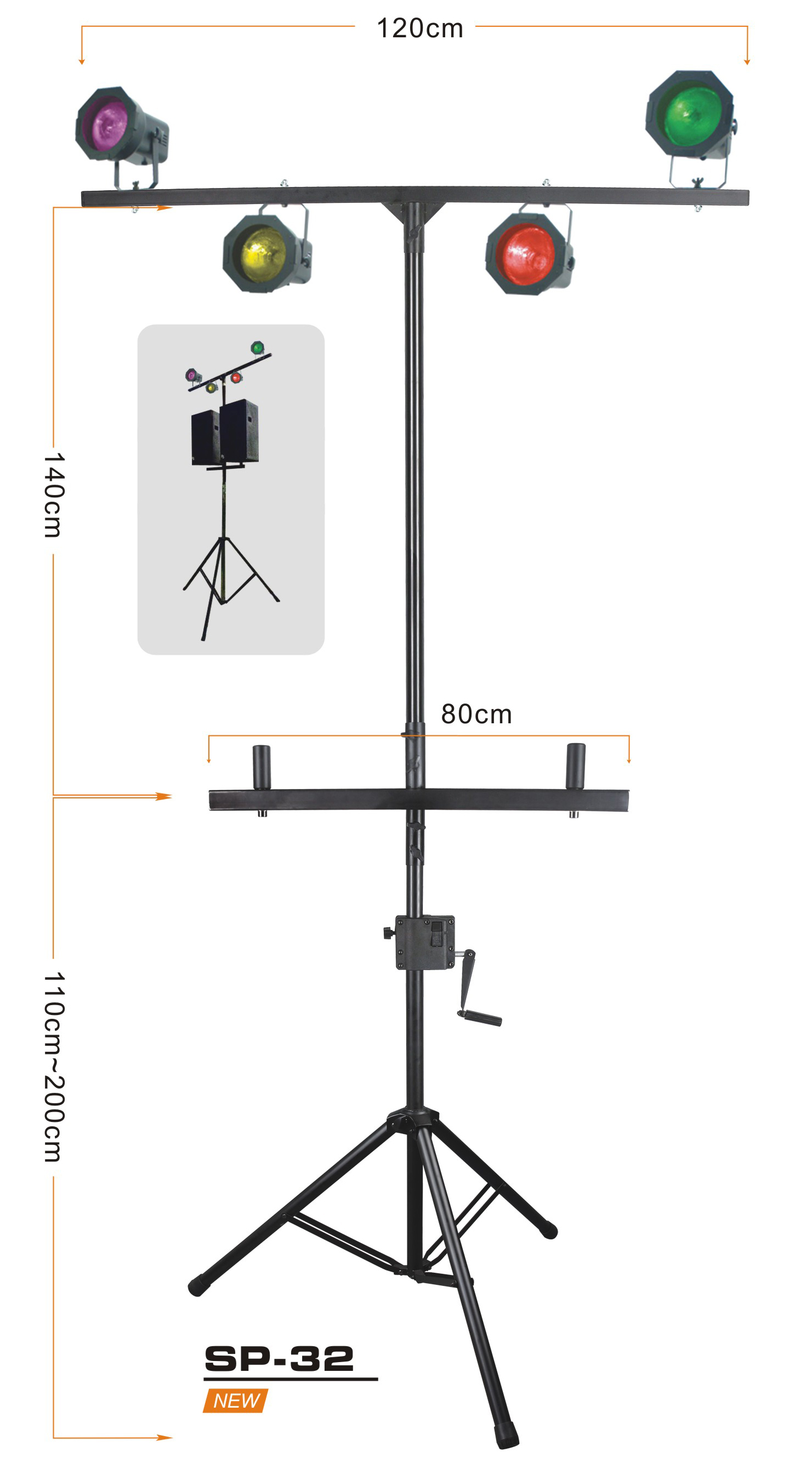 Трипод-стэнд, стальной, для установки двух акустических систем и четырех световых приборов, Ø 35мм, высота установки АС 110-200 см, высота установки световых приборов 250-340см, вес 10,5кг, максимальная нагрузка 100кг. Пластиковая подъемная рукоятка, цвет черный.