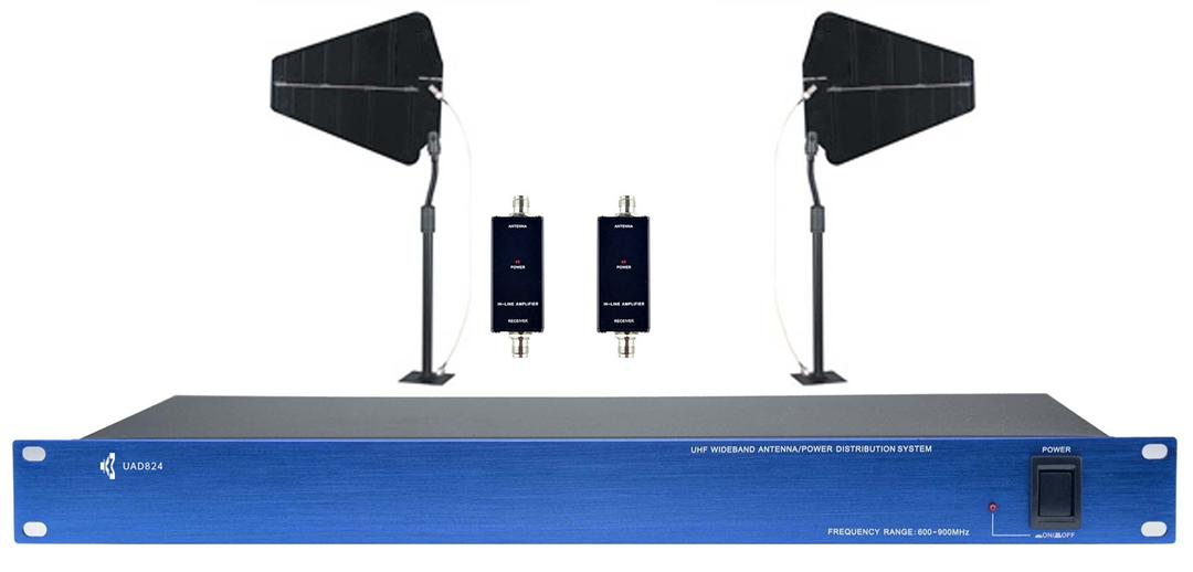 Система распределения сигнала для приемных антенн диапазона частот UHF, которая может распределять сигнал, принимаемый всего лишь парой антенн, на многоканальную беспроводную приемную систему. Встроенный РЧ усилитель системы компенсирует потери, возникающие при использовании нескольких антенных выходов. Один такой распределитель MVT UAD824 может обеспечить передачу УВЧ сигналов на антенны и раздачу питания постоянного тока 12 В для четырех приемников разнесенных сигналов.