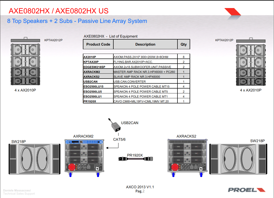 Арт.: Я0011190PROEL AXIOM AXE0802HX - Линейный массив. Комплектация: 8 элементов AX2010P (мощность 1400 Вт+300 Вт, НЧ/СЧ 2x10", ВЧ 2x1.4", 75Гц–18 кГц, SPL Peak 138 дБ, 110°x10°, 746х341х530 мм, вес 39,9 кг.), 2 рамы для подвеса KPTAX2012P, 2 cабвуфера SW218P (пиковая мощность 2400 Вт+2400 Вт, НЧ 2x18", 27 Гц–300 Гц, SPL Peak – 141 дБ, 1215х590х950 мм, вес 98 кг.), аудио процессор PC260, 6 усилителей мощности HPX6000 , 2 рэка на колесах AXRACK, 1 кабель обмена данными PR1920X, 1 конвертор USB2CAN, 2 комплекта крепежных элементов (спансеты и чеккели)