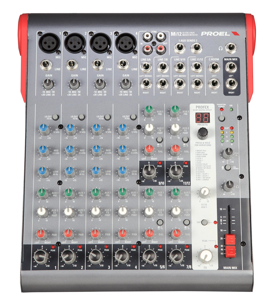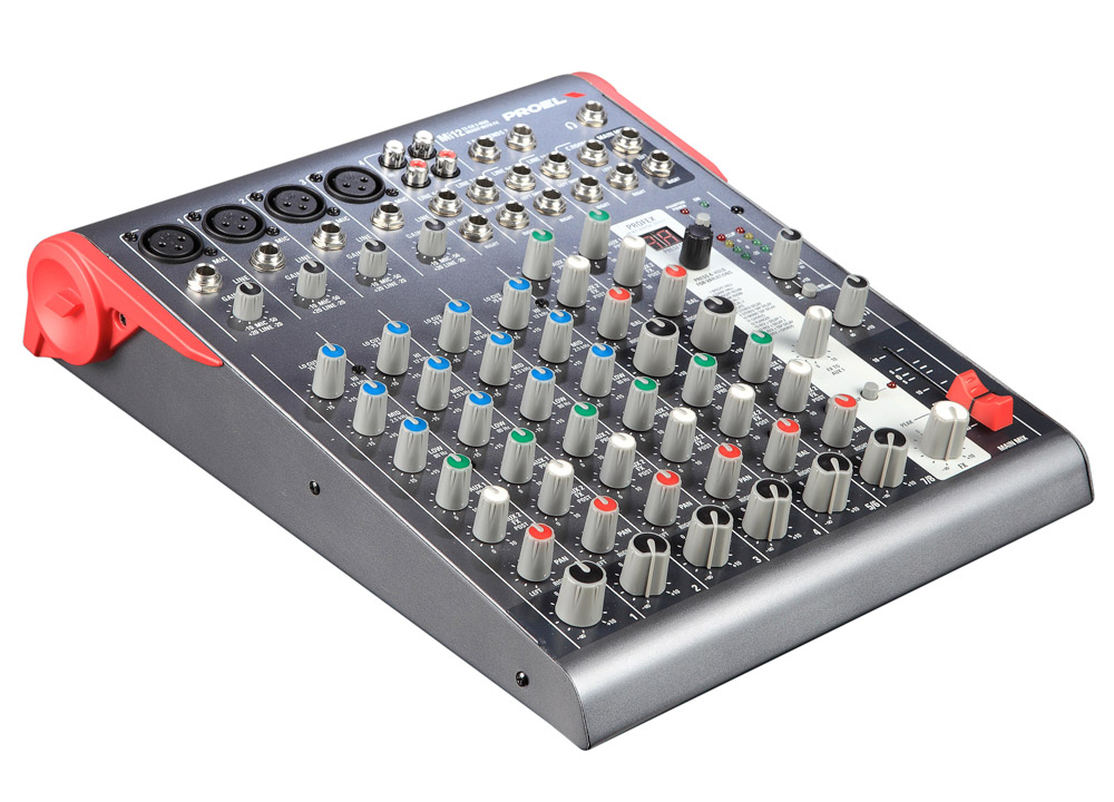 По запросуPROEL MI12 — компактный микшер 12 каналов, 2 шины, три тембра с параметрической серединой на каждом моно канале, DSP процессор, 3-полосный мастер эквалайзер, эффекты: 256 (16 пресетов x 16 вариаций). Входы: балансный XLR мама, балансный джек, выход: небалансный джек.