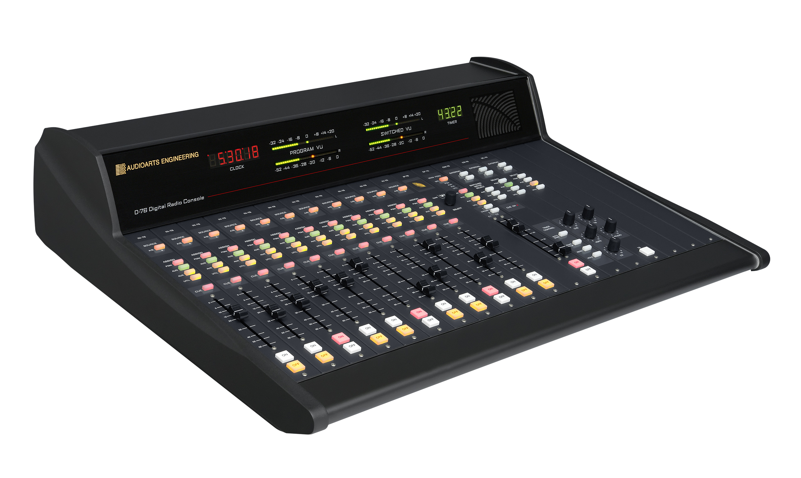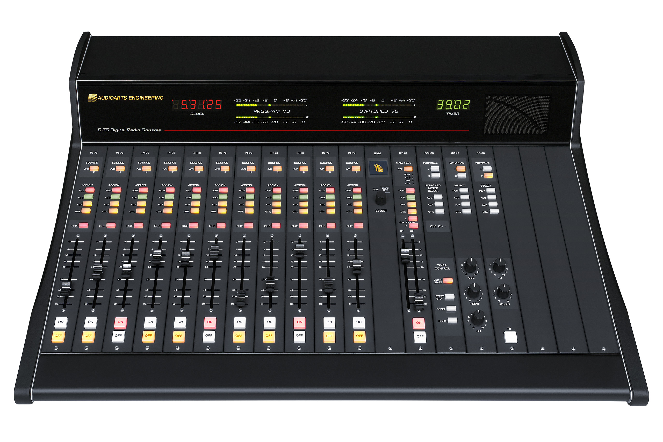 Консоль Audioarts D-76 доступна в 12- или 18/20 - канальном формате, имеет достаточное количество микрофонных предварительных усилителей, множество стереофонических шин, возможность подключения телефонных линий и удобную секцию мониторинга, обеспечивающую раздельную подачу сигнала на выход аппаратной/на наушники или на выход студийного монитора, а также разъем для наушников и встроенный динамик cue.