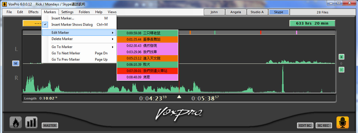 VoxPro способен практически мгновенно записать и редактировать аудио, используя интуитивные иконки и клавиши на панели управления. Запись производится на две дорожки, что позволяет комфортно редактировать контент и накладывать звуковые эффекты. Все популярные аудио форматы, включая MP3, MP2, WAV, AIFF и WMA могут быть импортированы и экспортированы индивидуально или в группах. Также имеется возможность использовать M4A (формат iTunes) при наличии стороннего кодека.