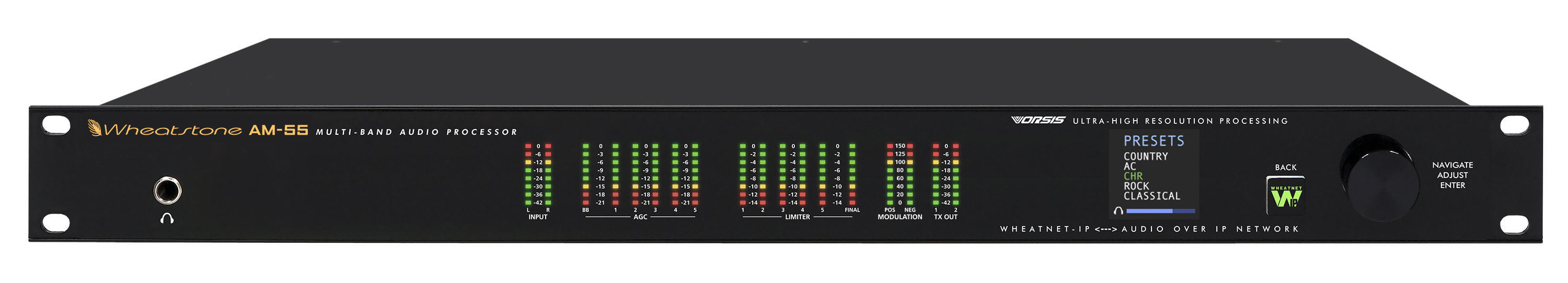 Wheatstone AM-55 оснащен системой контроля НЧ аудио процессора (Bass Management System) и поддерживает WheatNet-IP, что обеспечивает ввод и вывод сигнала с любой точки и в любую точку IP аудио сети и полную совместимость с эфирными консолями и контроллерами на базе WheatNet-IP. Продуманный дизайн, наглядный OLED дисплей, выход на наушники на передней панели, программное обеспечение Guru GUI в комплекте, а также высочайшее качество звука – это именно то, что вы всегда можете ожидать от аудио процессоров Wheatstone.
