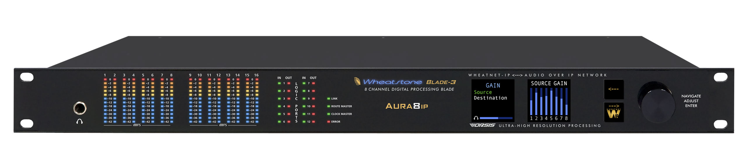 Wheatstone Aura8-IP Blade-3 оснащен I/O интерфейсом, включающим 4 пары цифровых аудио AES входов/выходов и четыре пары аналоговых стереофонических входов/выходов, а также он может выполнять функции автономного процессора. Каждый из 8 индивидуальных многопополосных стерео процессоров Vorsis состоит из 4-полосного параметрического эквалайзера, 3-полосного кроссовера, 3-полосного компрессора с функцией лимитера на каждой полосе и управляемого пик-лимитера. Благодаря технологии Wheatstone Blade-3, совместимой с интеллектуальной сетью WheatNet-IP, Aura8-IP Blade-3 позволяет создавать сети с творческой и мощной конструкцией и идеально подходит для использования в некоторых уникальных приложениях, связанных с динамическими функциями, с которым не так легко справляется обычное оборудование. К тому же, процессор Wheatstone Aura8-IP Blade-3 совместим с любым оборудованием, поддерживающим стандарт AES67, что обеспечивает ему непревзойдённую функциональность.