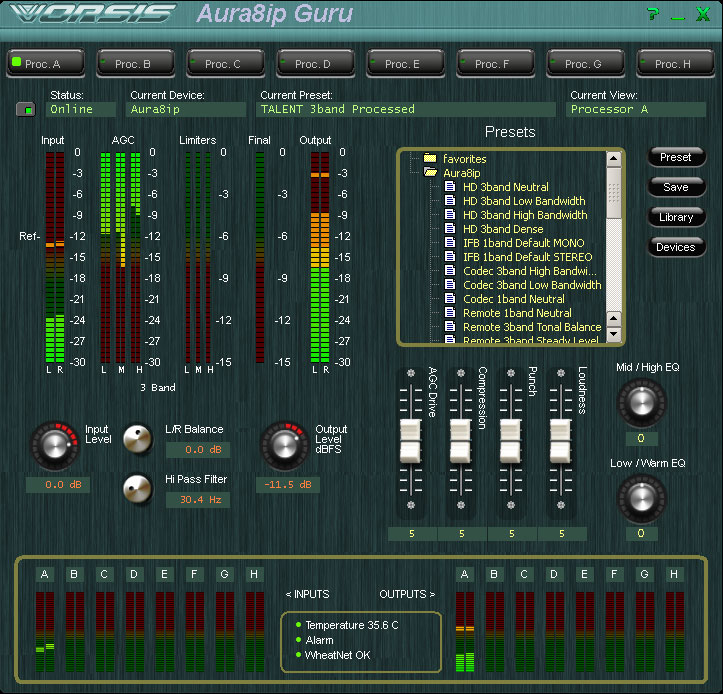 | Более 25 предустановленных и защищенных от записи пресетов Новые заводские пресеты можно скачивать с веб-сайта Wheatstone Processing и устанавливать с помощью программного обеспечения Aura8-IP |