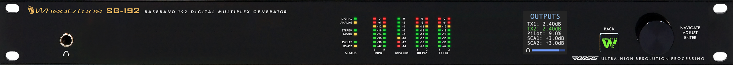 Цифровой генератор Wheatstone SG-192 предназначен для установки в радиовещательной студии или в месте нахождения ретранслятора в зависимости от потерь при передаче сигнала и обладает композитным ограничением с низким уровнем искажений и повышенной частотой семплирования. Высокоточный OLED-дисплей на передней панели позволяет легко управлять работой генератора Wheatstone SG-192, а удобный выход на наушники обеспечивает достоверный мониторинг входных сигналов.