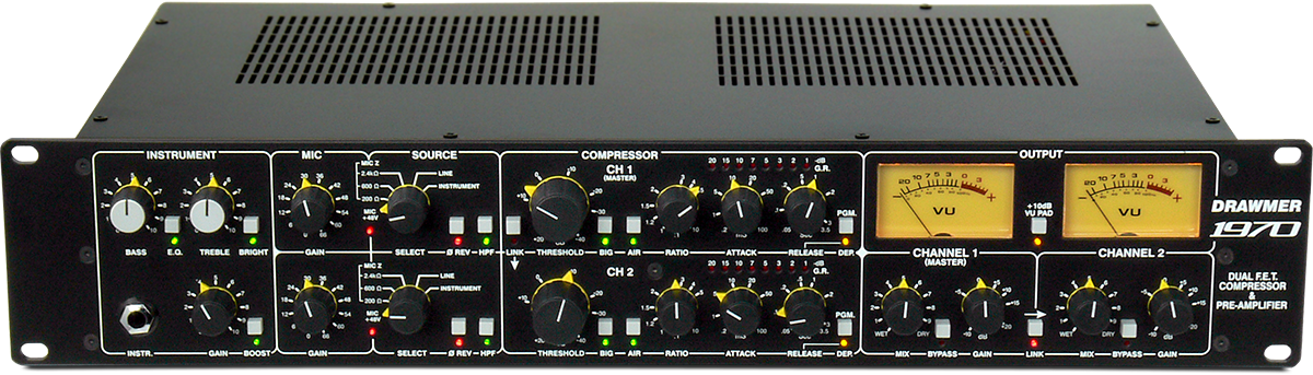 В 1970 используются новейшие технологии THAT Corporation в 2 микрофонных предусилителях для обеспечения сверхчистых, прозрачных и точных записей, которые могут быть обработаны на более позднем этапе с использованием вашего любимого метода «утепления», будь то сатурация, лампа, трансформатор или лента. Кроме того, каждый канал имеет усиление 66 дБ, с переключаемым импедансом микрофона для точного согласования микрофонов и получения наилучших результатов от любого используемого микрофона. Также включены фантомное питание, переворот фазы и фильтр высоких частот. От инструментального «треккинга» через специальный модуль D.I. до записи вокала через ультра «прозрачные» микрофонные предусилители, записи гитарного кабинета с двумя микрофонами или вокалиста, играющего на гитаре, или даже компрессии стерео шины с использованием комплексных средств линкования и микширования, Drawmer 1970 является идеальным универсальным инструментом для любой студии или вещания.