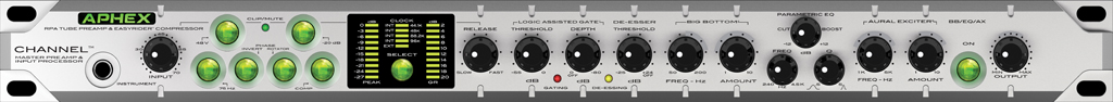 По запросуAphex CHANNEL - Ламповый микрофонный предусилитель + компрессор (Easyrider®) + гейт (Logic-Assisted Gate) + раздельно-полосный де-эссер + параметрический EQ + эксайтер (Aural Exciter + Big Bottom) + ЦАП 24 бит, 96кГц, AES, S/PDIF.