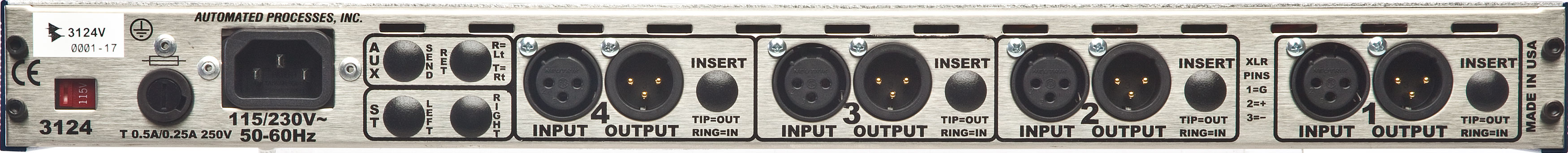 API 3124V обеспечивает усиление до 65 дБ. Сигнал с высокоомного (Hi-Z) входа на передней панели поступает прямо на операционный усилитель, что позволяет осуществлять усиление входных сигналов низкого уровня, например, гитары или баса, без согласующего трансформатора или директ-бокса. Входы Hi-Z позволяют подавать входные сигналы с уровнем +20dBu, поэтому великолепно подходит для подключения клавишных инструментов и других устройств с высоким выходным уровнем. На задней панели располагаются разъемы XLR папа для выхода каждого канала.