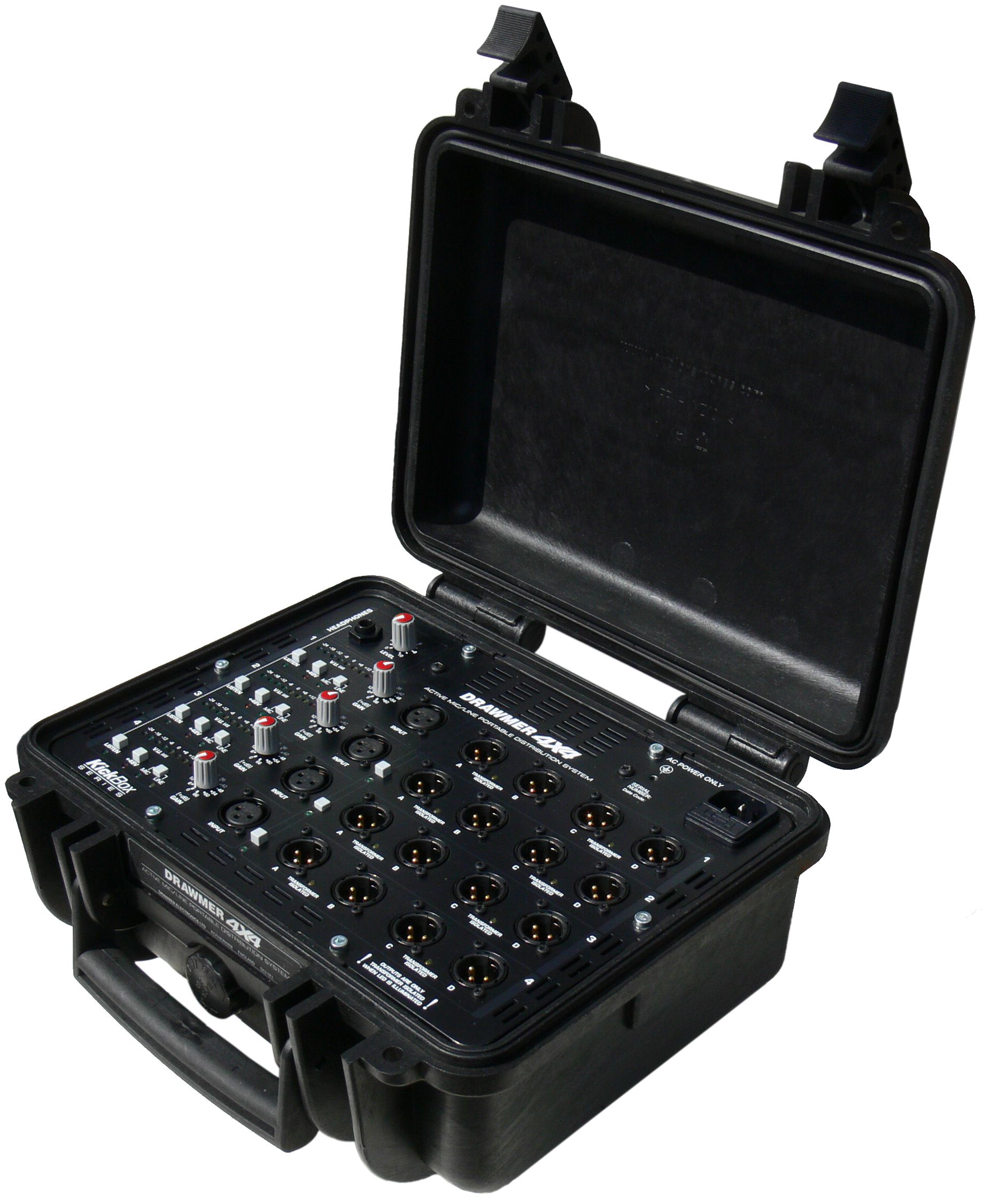По запросуDrawmer 4x4 KickBox - активный портативный сплиттер в пластиковом кейсе с 4 микрофонными / линейными входами и 16 выходами (изолирующий трансформатор опционально).
