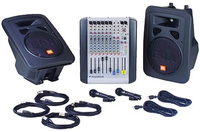 По запросуJBL E-System 10 - комплект из 2-х активных акустических систем по 175 вт, микшерного пульта 6 каналов, 2 -х микрофонов