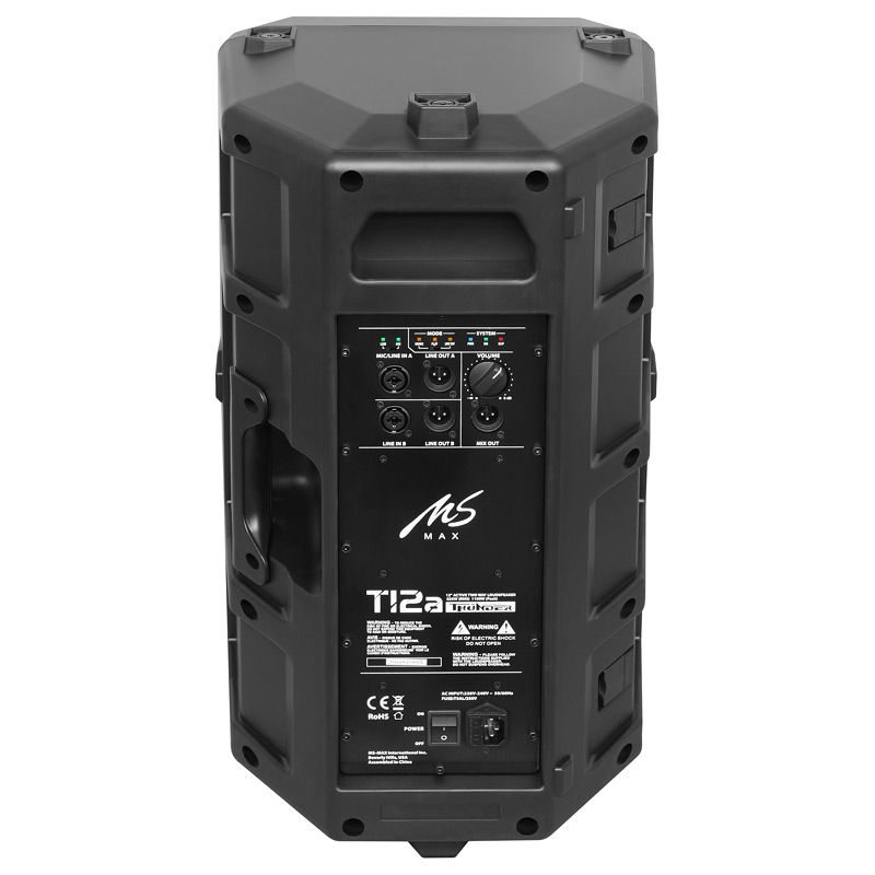 Арт.: Я0010004MS-MAX T12a «Thunder» - активная 2-полосная акустическая система, 825Вт / 1100 Вт (RMS/Peak) НЧ 12", ВЧ 1.7", 50Гц-20кГц, 119/125дБ, 90°х60°, усилитель класса D, двойной "стакан" для установки на стойку Ø35мм, точки подвеса, встроенная система защиты, пластиковый корпус, 368x630x349 мм, 21.5 кг