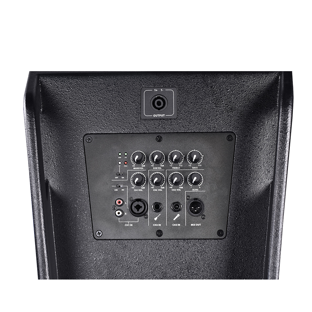 Это мощная деревянная активная акустическая система с высоким уровнем звукового давления с одним 15-дюймовым НЧ-динамиком, шестью 2,75-дюймовыми среднечастотными динамиками, двумя 1-дюймовыми купольными твитерами и двухполосным усилительным модулем КЛАССА D, с опорной стойкой с регулируемой высотой