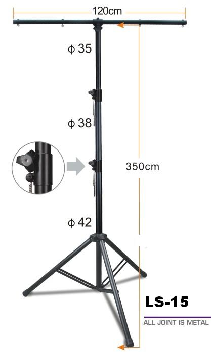 Арт.: Я0015642MVT LS-15 - Трипод-стэнд, стальной , Т-образная (с перекладиной) , для установки светового оборудования, максимальная высота 3,5м, длина перекладины 120см,вес 7,5кг, максимальная нагрузка 50кг, 4 болта для подвеса прожекторов, все соединения выполнены из металла (сталь).