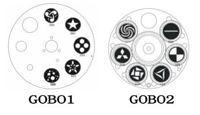 7 статичных гобо рисунков + открытый, вращение колеса гобо по и против часовой стрелки, эффект тряски |