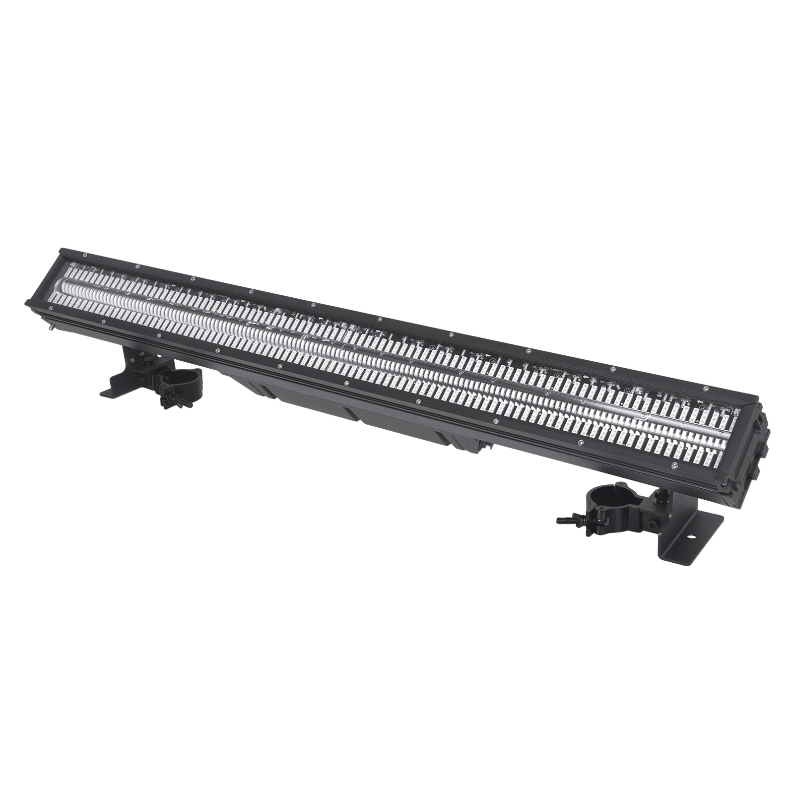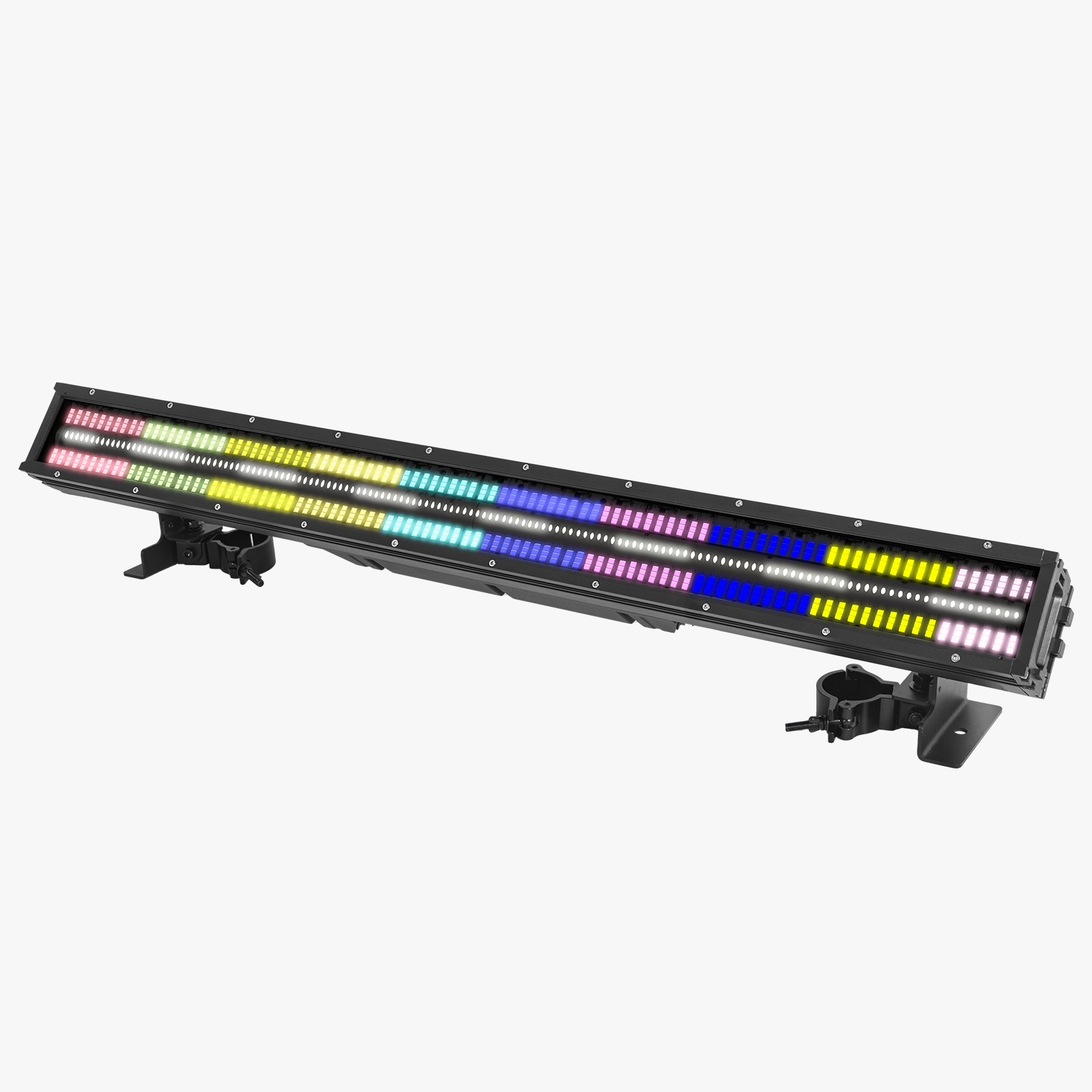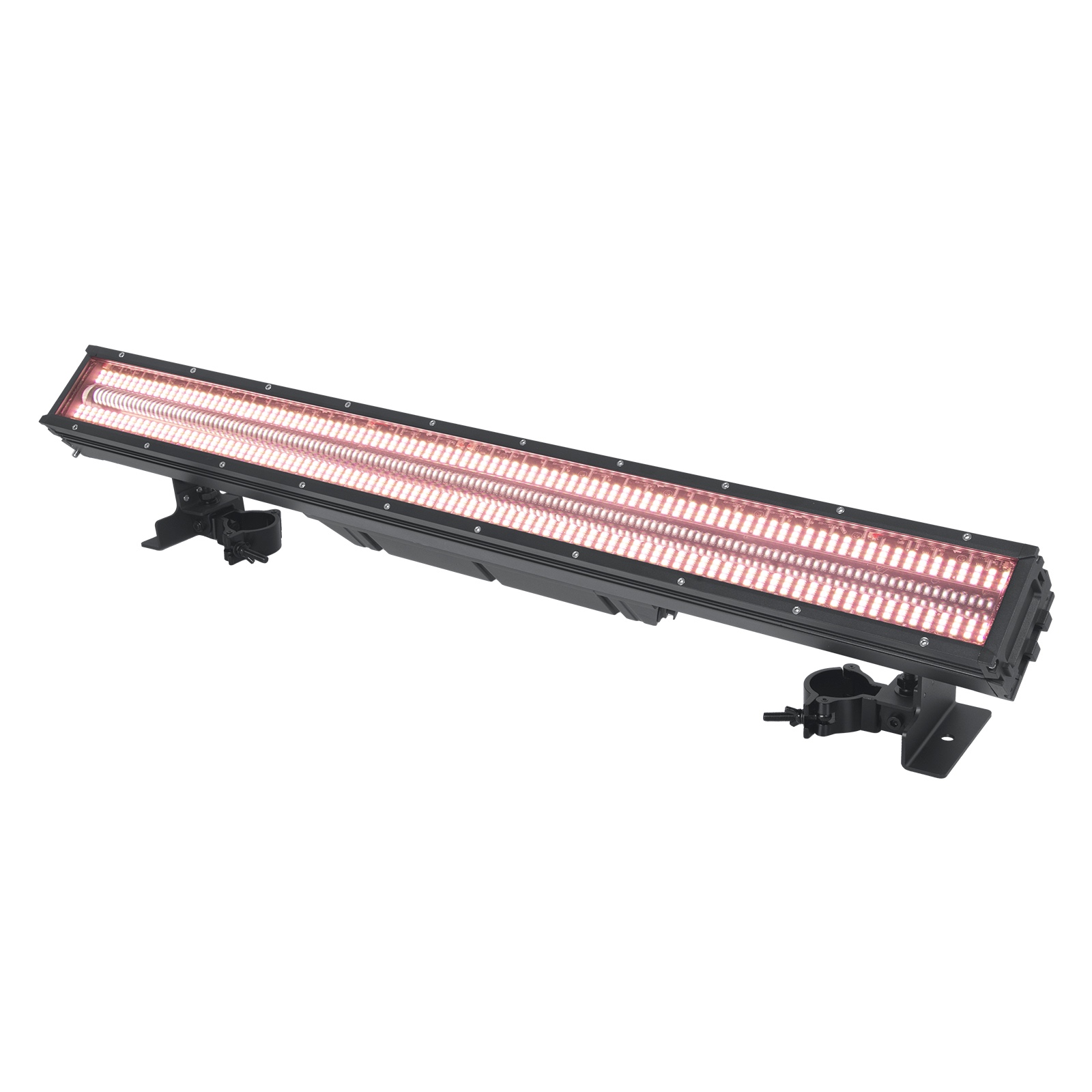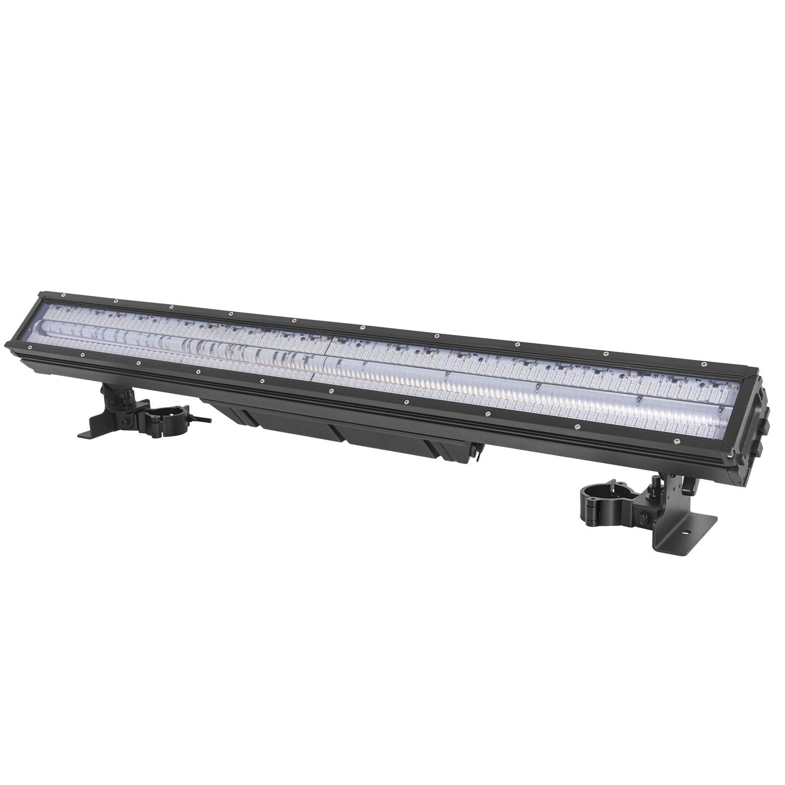 Линейный светодиодный стробоскоп 288 шт. - 3Вт светодиода "холодный белый" + 864 - 0,5Вт светодиода RGB. В комплекте со складными струбцинами (позволяют ставить прибор на пол, закреплять на ферму и убирать в транспортировочный кейс без демонтажа струбцин), страховочным тросиком и сигнальным кабелем DMX, Всепогодная версия IP65. Управление DMX/RDM
