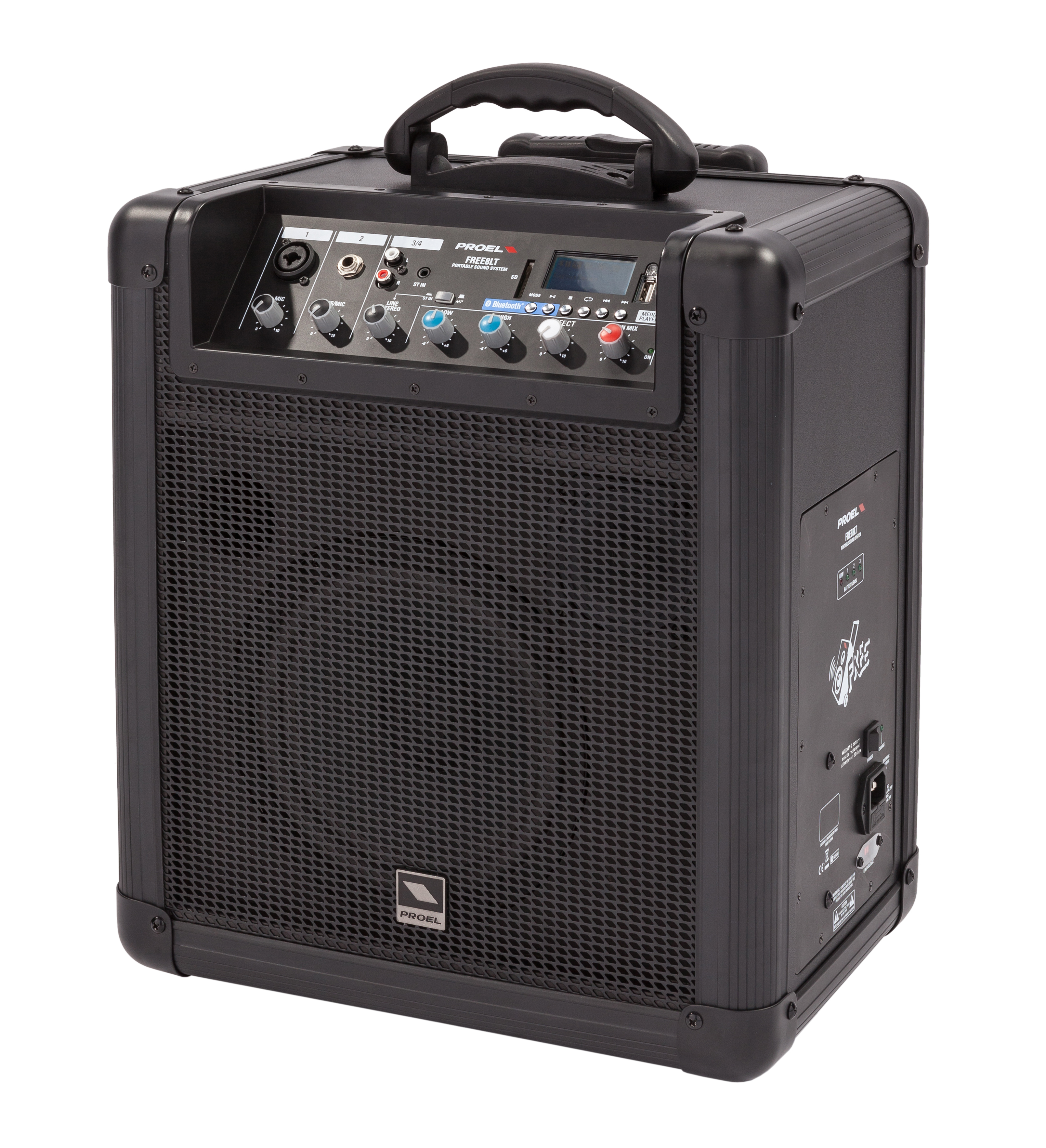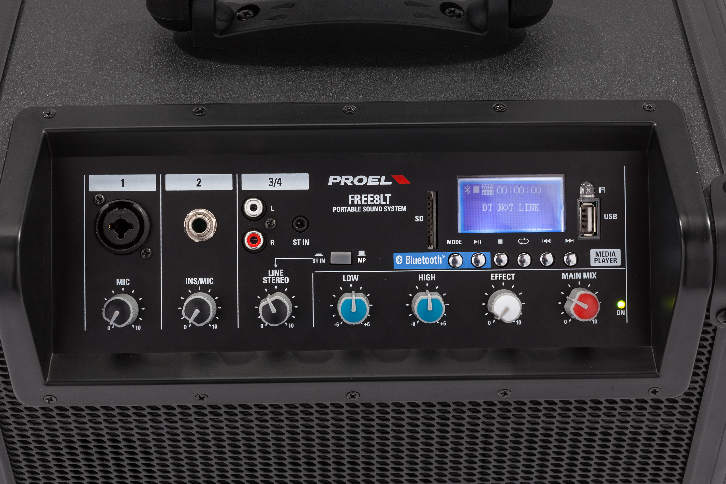 По запросуPROEL FREE8LT - портативная активная акустическая система, НЧ 8", ВЧ 3", усилитель 20 Вт, 65 Гц-15 кГц, встроенный MP3-плеер с USB, SD-слот, Bluetooth, LCD дисплей, удаленное управление, входы 2xMIC/LINE, 1xSTEREO LINE, работа на батарейках (1x12 В/5 А) 2-3 часа, питание 115 В или 230 В ~ 50/60 Гц, вес 12 кг, размеры (ШxВxГ) 465x510x375 мм.