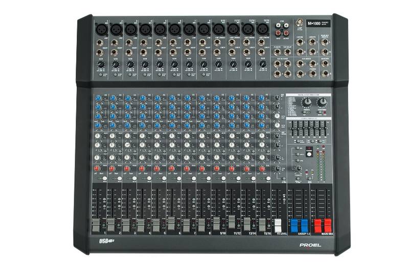 Арт.: Я0007160PROEL M1000USB - Активный микшер 16 каналов 2 х 500Вт (12 микрофонных + 8 линейных +4 стерео), три тембра с параметрической серединой на каждом моно канале, DSP процессор, 7-и полосный мастер эквалайзер, USB для соединения с компьютером, Входы: 2 XLR, 2 комбинированных XLR/TRS - балансный джек, по два - TRS -джека на стерео входах. Выходы: Мастер - балансный XLR и джек, питание от сети - внешний блок питания, чехол для хранения и рэковое крепление в комплекте. вес:9,3кГ