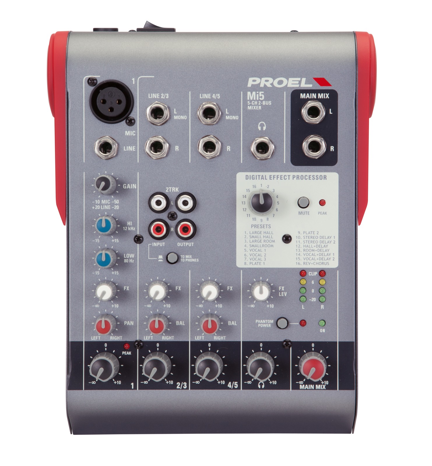 PROEL MI5 - Ультра-компактный микшер 5 каналов, 2 шины, потребляемая мощность 17 Вт, процессор эффек