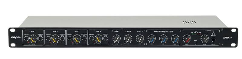 По запросуPROEL AMIX7A — Автоматический микшер с четырьмя микрофонными входами XLR, которые управляются схемой нойс-гейта. Три линейных входа, один симметричный выход XLRи два несимметричных выхода для осуществления записи входного сигнала каждого микрофона дополняются источником фантомного питания 24 В.