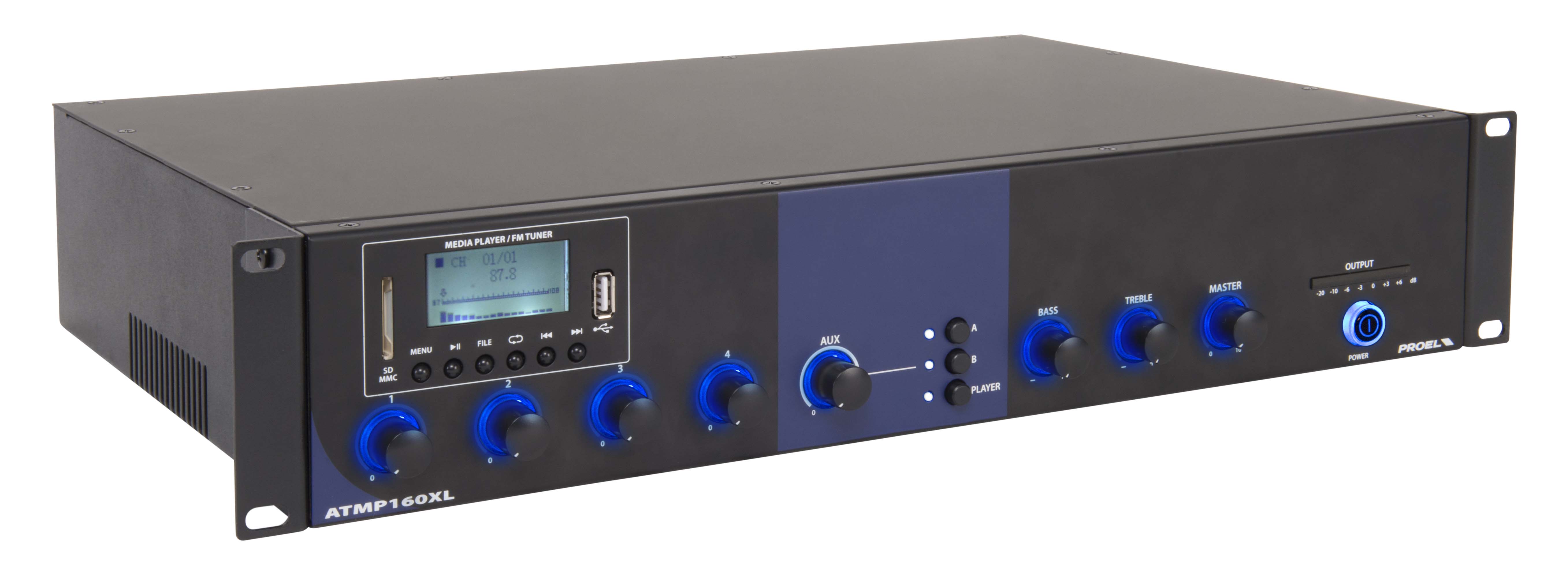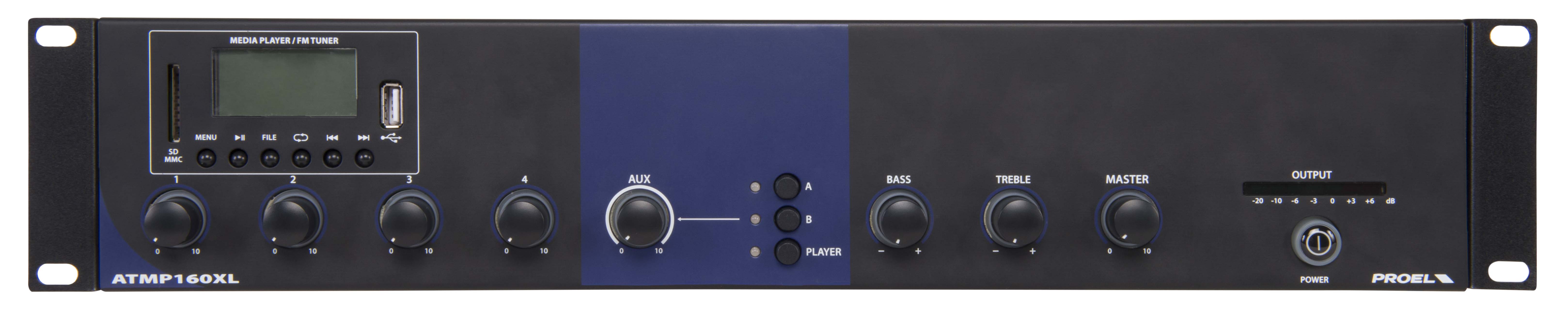 PROEL PA ATMP160XL – микшер-усилитель с встроенным проигрывателем цифровых и аналоговых аудио сигналов, мощностью 160 Вт. С возможностью подключения трансляционных акустических систем 70/100 В или 4 Омной нагрузки Выполнен в корпусе для монтажа в стандартную стойку 19''. Встроенный проигрыватель позволяет воспроизводить файлы формата MP3 с USB/SD MMC и Bluetooth, а также в прибор встроен тюнер FM радио. Устройство имеет четыре входа Mic/Line с фантомным питанием 48 В, два входа небалансного стерео 2х(2хRCA), выходы балансного моно и небалансного стерео (2хRCA) сигналов.