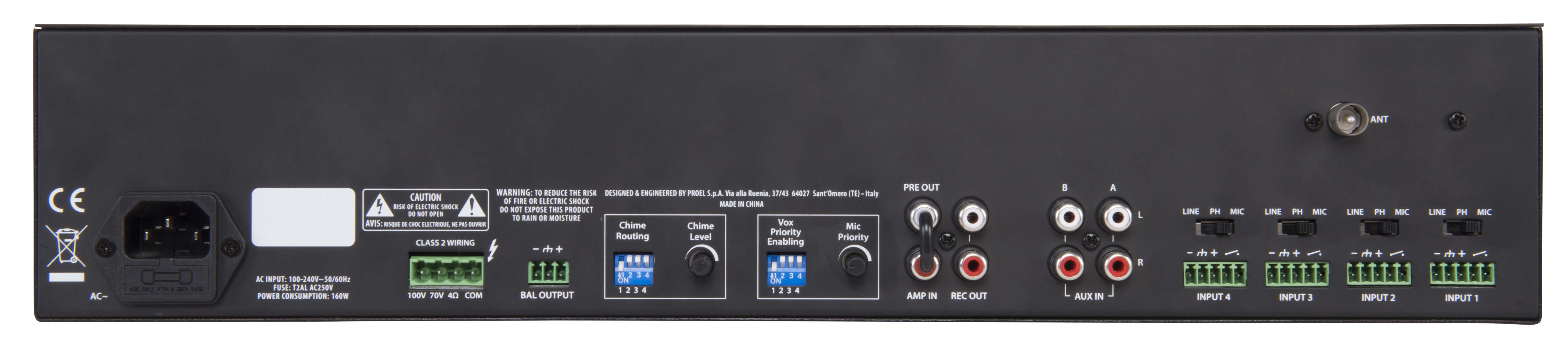 Трансляционный микшер/усилитель/проигрыватель аудио файлов: Bluetooth, MP3, FM-тюнер, SD MCC/USB. 160Вт на 70/100В или 4 Ом. 4 входа Mic/Line с фантомным питанием 48 В, два небалансных стерео входа (RCA), выходы симметричный - моно, небалансный - стерео (RCA) .