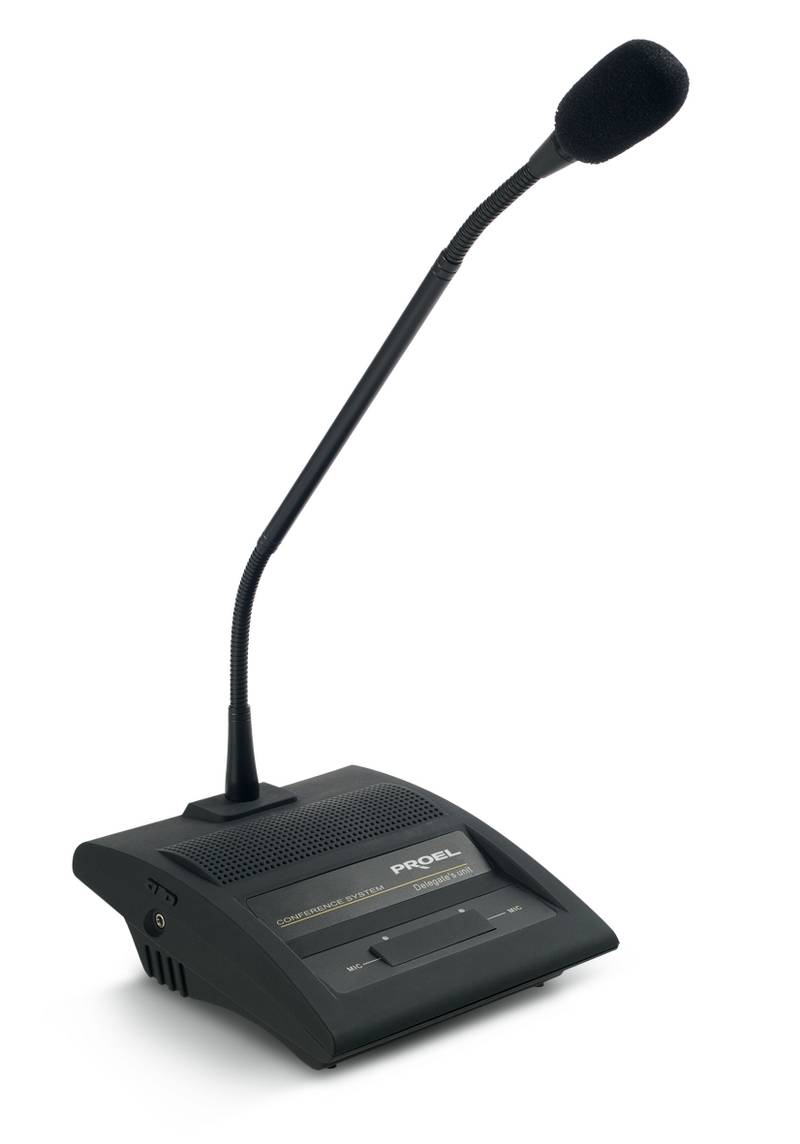 По запросуPROEL PA BDE — Настольный микрофон делегата. Конденсаторный микрофон "гусиная шея" на пластиковой подставке, встроенный мониторный динамик, выход для наушников, кнопка включения микрофона. В комплекте: соединительный кабель 2 м.