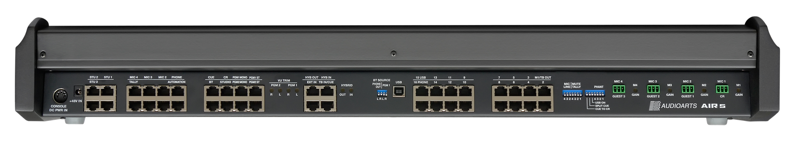 Консоль Audioarts Air-5 имеет 16 входных каналов, 2 программные шины, а также оснащена встроенным динамик CUE и CR, разъемами Мonitor и Headphone для внеэфирного мониторинга. Четыре встроенных микрофонных предусилителя позволяют использовать микрофонные входы (для ведущего и 3 гостей) без подключения какого-либо внешнего оборудования.