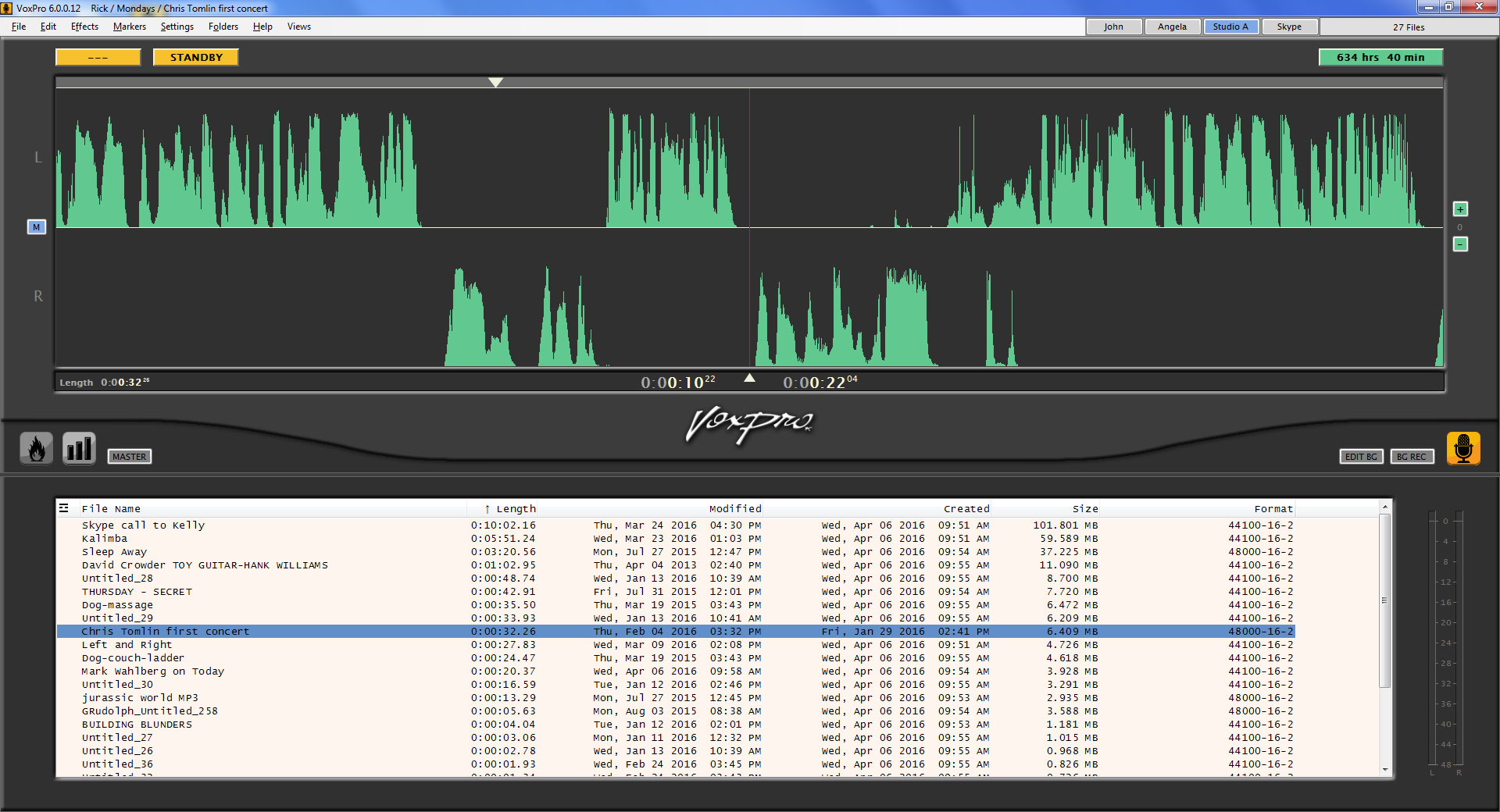 VoxPro способен практически мгновенно записать и редактировать аудио, используя интуитивные иконки и клавиши на панели управления. Запись производится на две дорожки, что позволяет комфортно редактировать контент и накладывать звуковые эффекты. Все популярные аудио форматы, включая MP3, MP2, WAV, AIFF и WMA могут быть импортированы и экспортированы индивидуально или в группах. Также имеется возможность использовать M4A (формат iTunes) при наличии стороннего кодека.