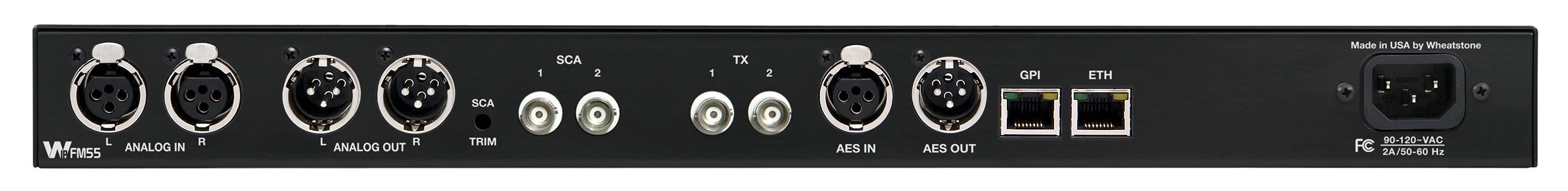 Радио процессор FM-55 полностью поддерживает WheatNet-IP Intelligent Network. Он имеет два отказоустойчивых аналоговых композитных выхода (BNC), два SCA входа, симметричные аналоговые L/R выходы, а также цифровой выход AES, который может переключаться между дискретным L/R и baseband192.