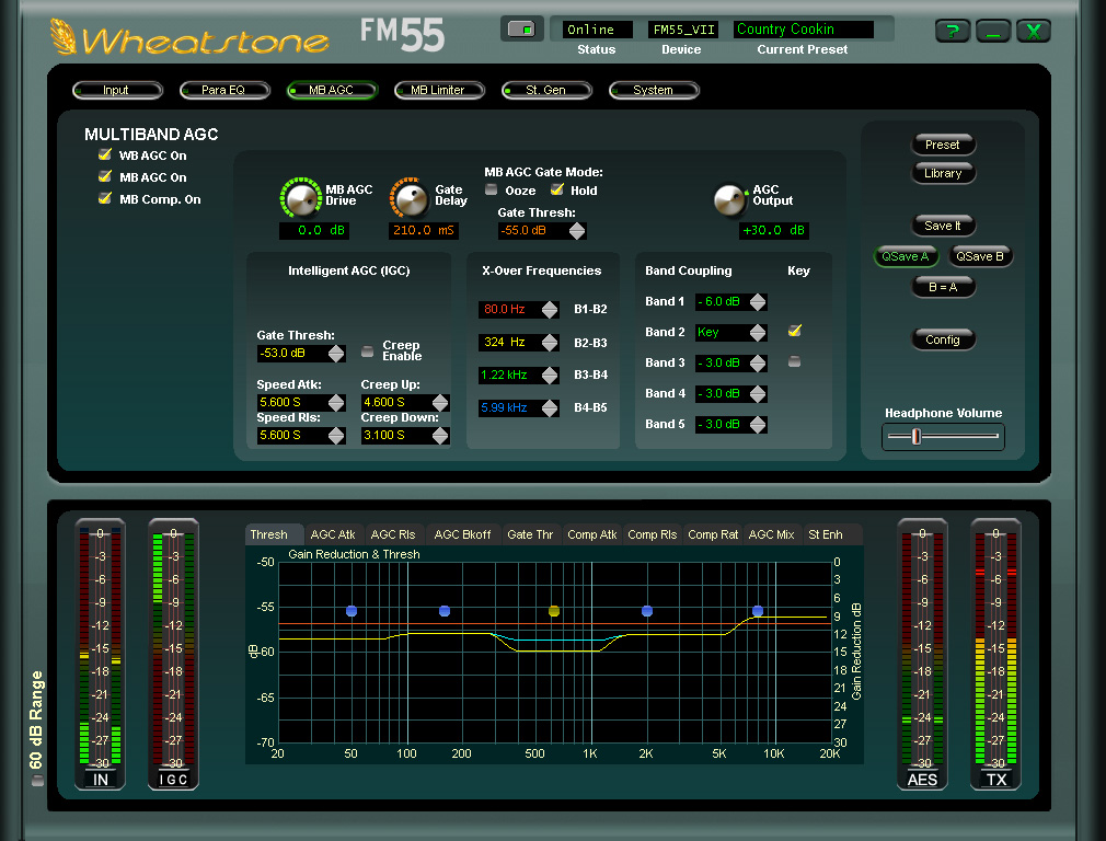 Еще одной функцией Wheatstone FM-55 является пятиполосное расширение стерео образа и программно-адаптивный L-R контроль многоуровневого смягчения сигнала.